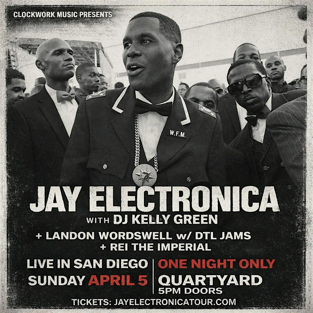 Jay Electronica live in San Diego on Sun April 5th with Landon Wordswell, Rei The Imperial, 18 Scales, and DJ Kelly Green.