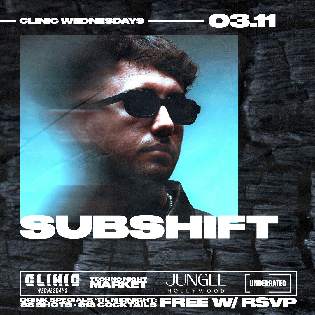 Clinic welcomes SUBSHIFT (Toolroom Records) Wednesday, March 11 🎟 Free entry with RSVP (10–11 PM) 🍸 Drink Specials ‘til Midnight • $8 Shots • $12 Cocktails 🛍 Outdoor Vendor Market ✨ For VIP Table Reservations & Inquiries: info@underratedpresents.com 21+ | All Sales Final Presented by Underrated Presents. This is a 21+ event