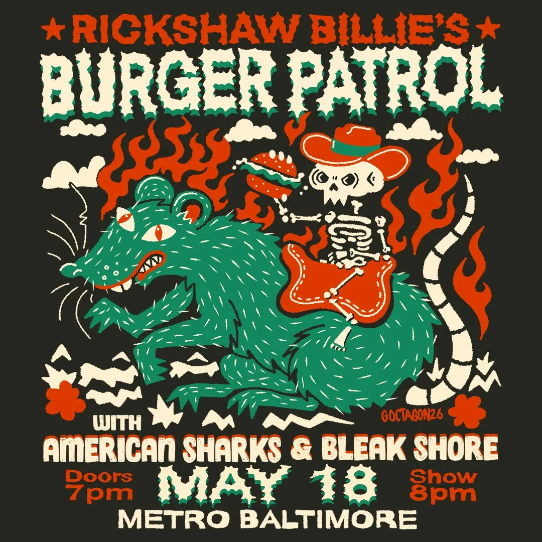 RICKSHAW BILLIE'S BURGER PATROL CA$H GRAB 2026 TOUR with American Sharks and Bleak Shore Monday May 18, 2026 Doors at 7:00 PM, Show at 8:00 PM All Ages Presented by Metro Gallery LLC. All ages