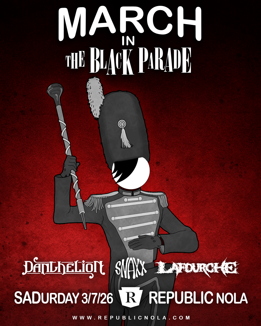 The Sad Parade comes MARCHING into Republic on SADurday 03.07.26 with Dan The Lion, Lafourche, and Snaxx!