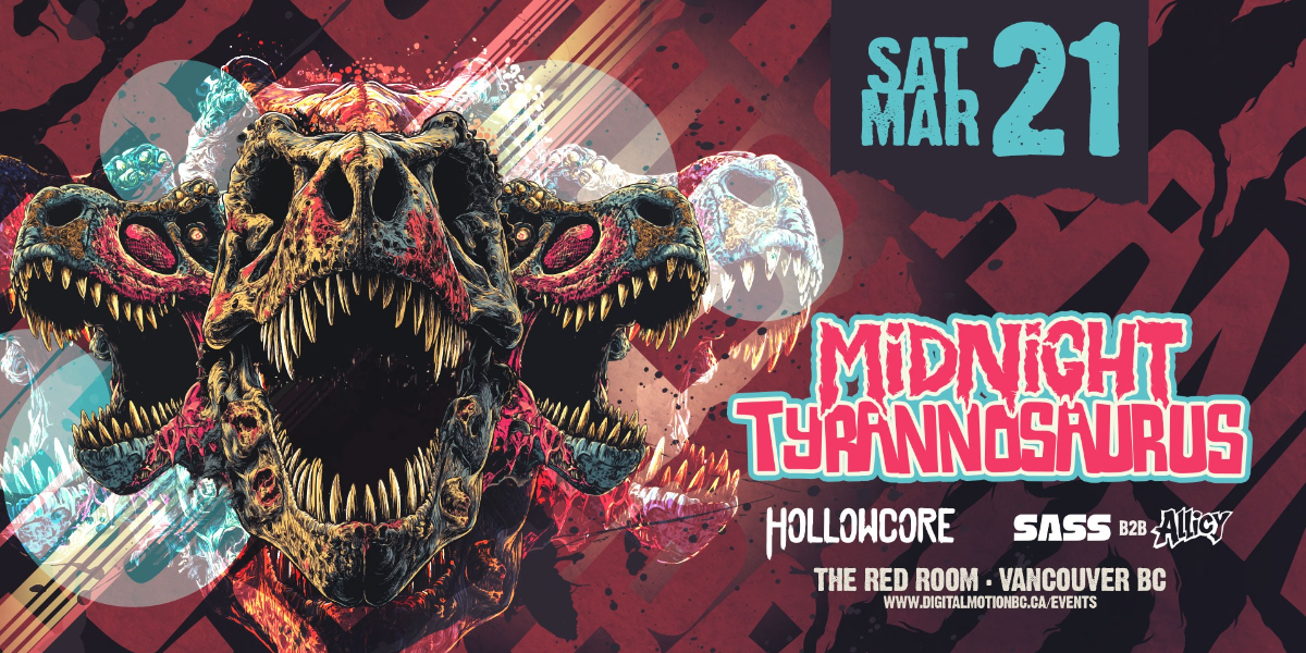 Digital Motion presents SUBculture Saturdays 3.21.2026 Prehistoric dubstep heavyweight Midnight Tyrannosaurus is back at The Red Room to kick off spring in a BIG way! Prepare for a night of bone-rattling riddims and bass through PK Sound that will leave you roaring for more! lineup: MIDNIGHT TYRANNOSAURUS https://linktr.ee/midnightasaurus https://soundcloud.com/midnightasaurus with local support from HOLLOWCORE https://www.instagram.com/hollowcoredubz SASS B2B ALLICY https://www.instagram.com/sasskilla https://www.instagram.com/allicy.xo The Red Room's PK Sound system will be in place for a proper bass & electronic music experience. We play it loud and proud! Hearing protection is strongly advised. Our high fidelity, reusable ear plugs will be available for purchase at coat check or at our apparel table if you need solid reinforcements. Doors open at 10:00pm sharp. Open and serving Music, Drinks and strong vibrations until 3am. Plan accordingly, arrive early to avoid the line and to support all of the artists on the lineup. 19+ only with 2 pieces of valid ID to enter ★ Mature PLUR vibes ★ Please respect the venue, your neighbours & party responsibly. Big thanks to everyone coming down early to set the vibe. *Harm reduction and extra support will be available via our SAFEculture team all night* Please read through our code of conduct before buying tickets and attending our events --> https://digitalmotionbc.ca/code-of-conduct