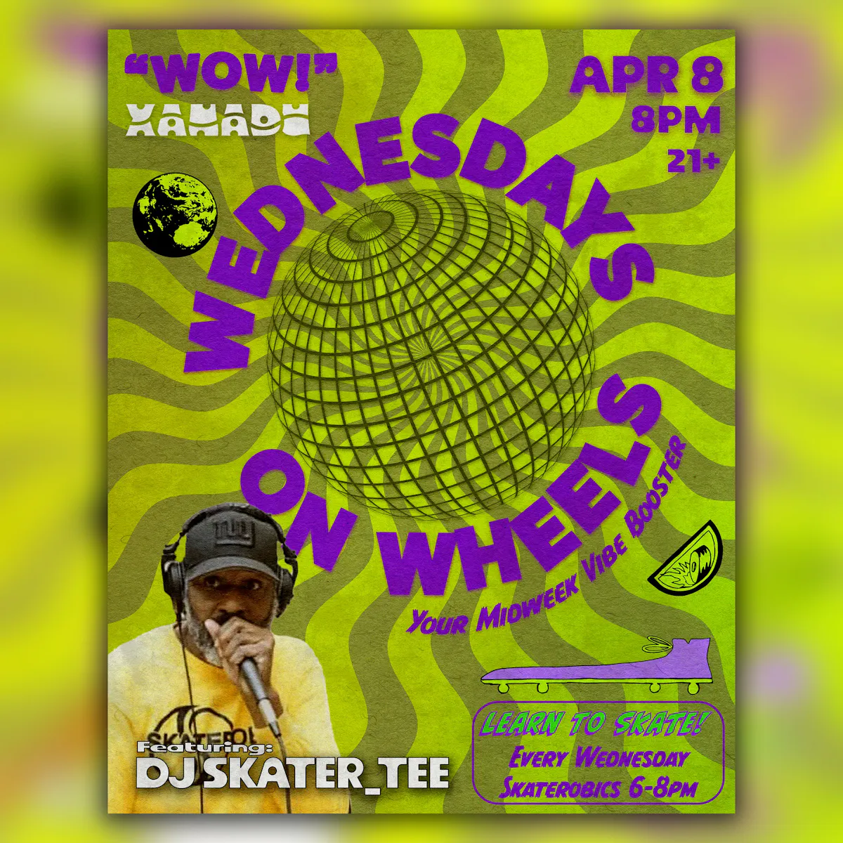 ***Wednesday nights are for skating! Whether you’re new to life on wheels or are a seasoned pro, you’re invited to the hottest mid-week vibe boost! Come early for Skaterobics at 6PM (you must purchase a separate ticket) to learn to dance on wheels.***