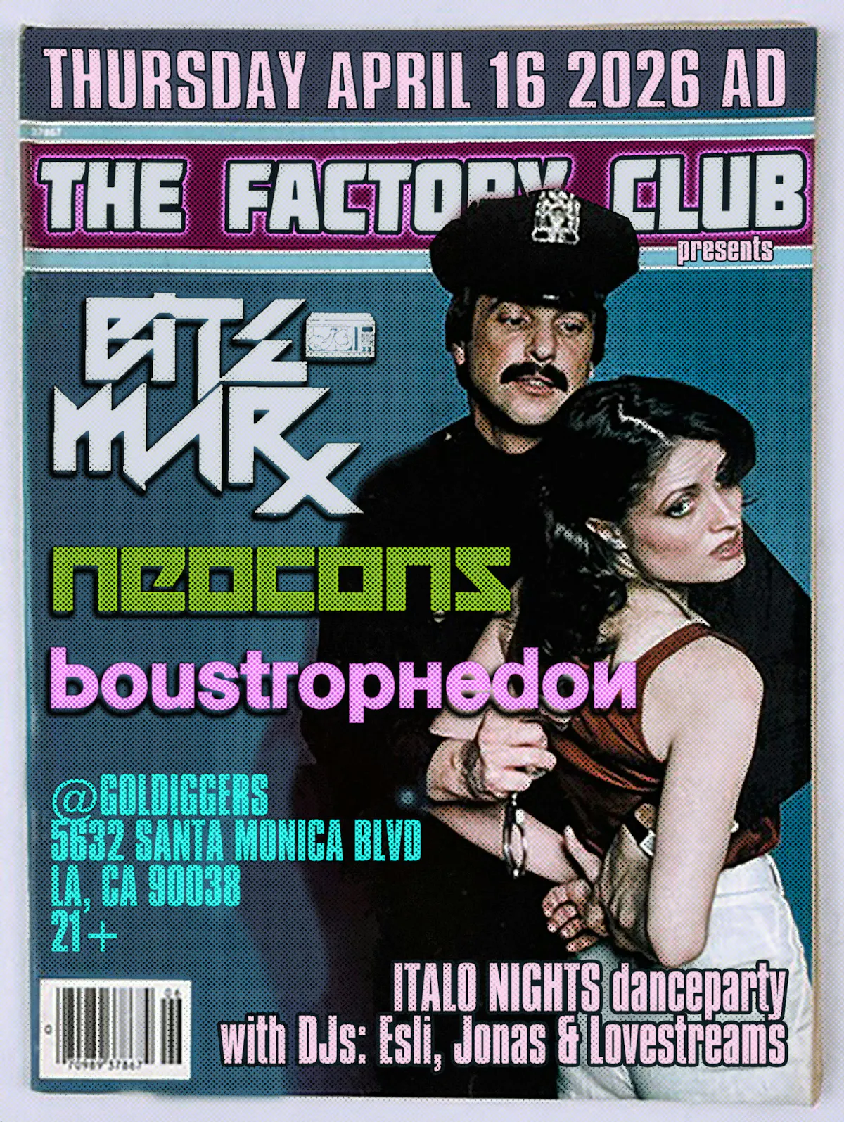 The Factory Club presents **Bitemarx, Boustrophedon, Neocons** plus Italo Nights after-party with Esli, Jonas, Lovestreams Presented by Gold-Diggers. This is an 21+ event