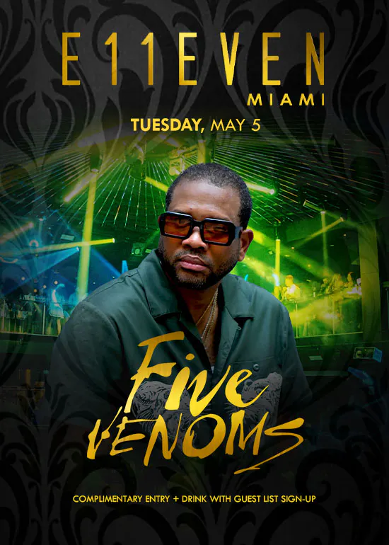 Rolling Loud's official DJ, Five Venoms at E11EVEN Tuesday, May 5. Complimentary Entry + a Drink with Guest List Signup. #1 Club in the USA, #6 Globally by Nightlife International Association.