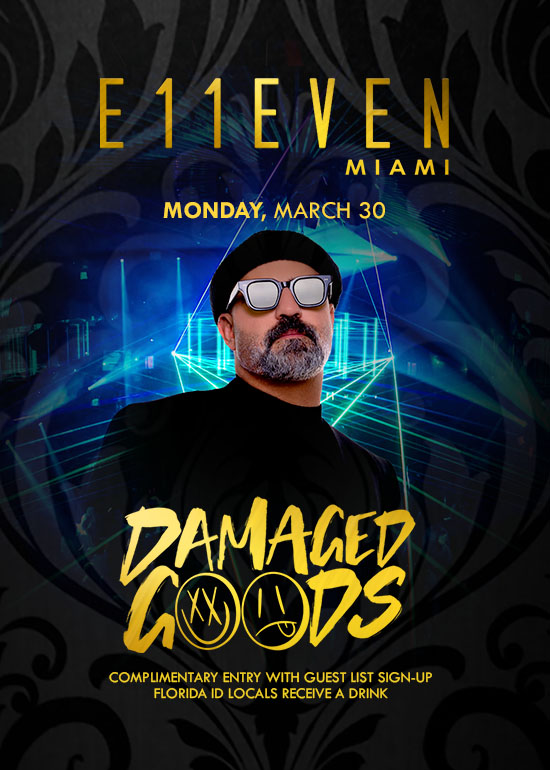 Damaged Goods at E11EVEN Monday, March 30. Complimentary Entry with Guest List Signup + FL locals receive a drink. #1 Club in the USA, #6 Globally by Nightlife International Association.