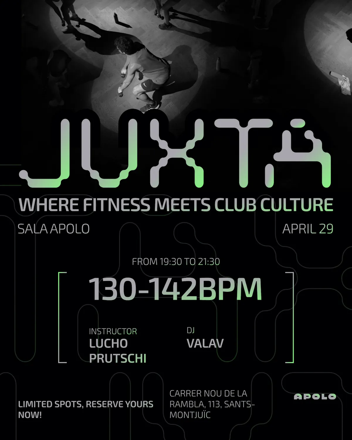 Lleva tu workout al siguiente nivel en una de las pistas de baile más legendarias y antiguas de Europa. Para este evento presentamos una sesión de **JUXTA 130–142 BPM**, cuyo nombre proviene de los beats por minuto (BPM), el ritmo que mantendrás durante toda la sesión. **DJ Valav** ha creado un viaje sonoro entre drums profundos, texturas cinematográficas y ritmos rotos con tintes psicodélicos.