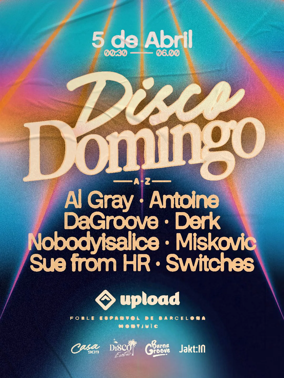 Las noches de Barcelona llevaban tiempo pidiendo algo un poco más… groovy. Por eso, el 5 de abril, Disco Exotic, Barna Groove, Casa 909 y Jakt:in unen fuerzas para devolver el groove a Barna en la legendaria Sala Upload.