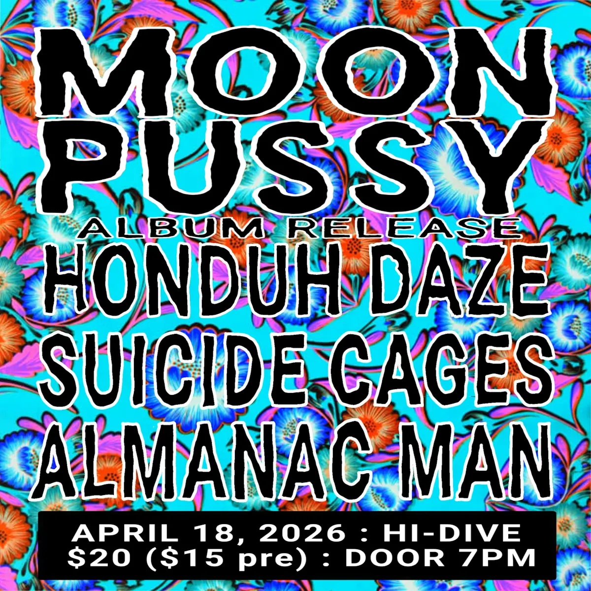 MOON PUSSY (Album Release Show) with HONDUH DAZE + SUICIDE CAGES + ALMANAC MAN (7pm Doors/8pm Show) Presented by Hi-Dive. This is a 21+ event