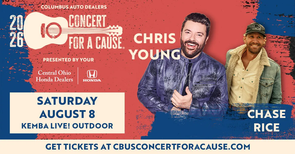 The Columbus Auto Dealers are proud to bring back the second annual Concert for a Cause® to KEMBA Live! Outdoor on Saturday, August 8, 2026! Presented by the Central Ohio Honda Dealers and in partnership with 92.3 WCOL & iHeartMedia, this unforgettable night of country music will feature multi-platinum superstar Chris Young and multi-platinum singer-songwriter Chase Rice in an incredible evening under the Columbus sky. More than just a concert, it’s a night with purpose—supporting two impactful organizations, Canine Companions and Charity Newsies, and giving back to the community we call home.