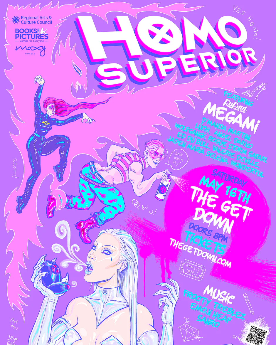 It’s our Y2Gayest Homo Superior yet! Megami (RuPaul’s Drag Race Season 16) returns to headline our annual X-Men-themed drag show & dance party, hosted once again by transcontinental cosplay icon D’Manda Martini. Kick it with us Saturday, May 16th — it’s just gonna be a few cool people and you better be one of them beyotch.