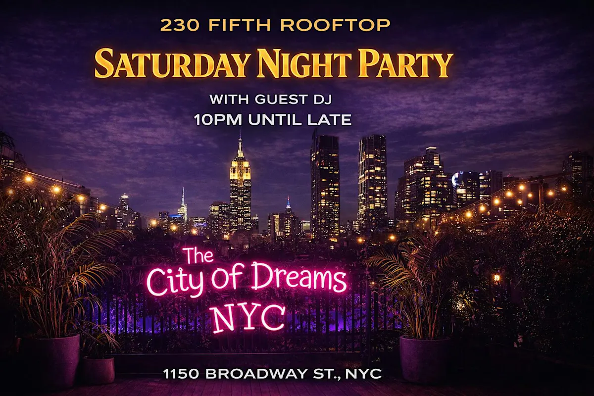 SATURDAY NIGHT PARTY @ 230 Fifth RooftopDance to the music by the top DJs at NYC's most famous rooftop & penthouse venue - 230 Fifth Avenue! Get skip-the-line tickets now for front-of-the-line status on event night!