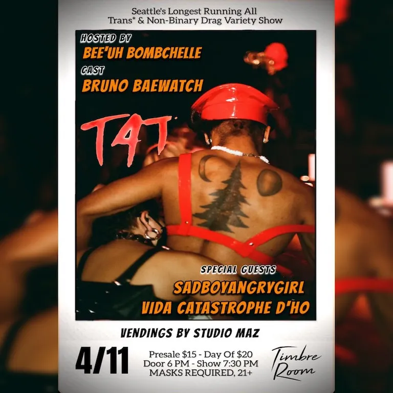 T4T is the longest running by and for all transgender and non binary produced and casted drag variety show in Seattle, a one of a kind celebration of trans artists. T4T is place for trans folks to enjoy drag, bask in gender euphoria, find community, and be with people who understand them.
