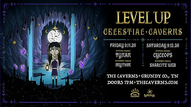 LEVEL UP is going down in THE CAVERNS in GRUNDY COUNTY, TN for a 2 NIGHT event — CELESTIAL CAVERNS — with special guests TYNAN and MYTHM on SEPTEMBER 11, and CYCLOPS and SHARLITZ WEB on SEPTEMBER 12, 2026.
