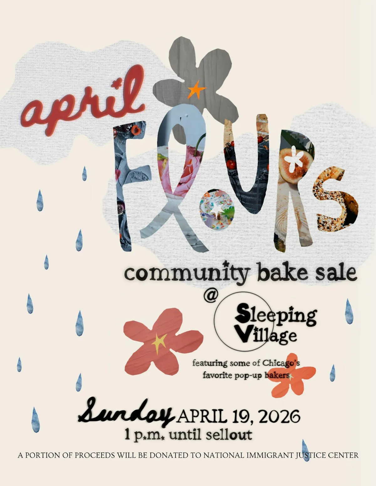 Join us on Sunday, April 19th for April Flours! Some of Chicago's favorite pop-up bakers are coming together for a community bake sale at Sleeping Village. Starting at 1pm until sellout, we'll have a number of delicious and unique pastries and bakes for you to purchase. The bar will be open all afternoon for coffee, cocktails, beer, wine, and many NA options. A portion of proceeds from the day will be donated to the National Immigrant Justice Center. To donate to NIJC directly, please visit immigrantjustice.salsalabs.org/donate