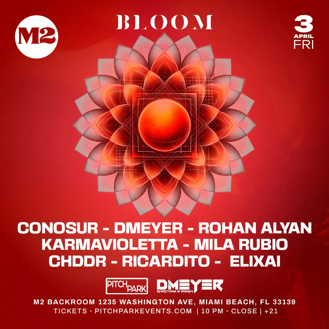 BLOOM is an intimate late-night journey into underground house music. Set in M2's Backroom, the night flows through deep, hypnotic rhythms and carefully curated sets by Rohan Alyan, DMeyer, Conosur, Ricardito, Chddr, KarmaVioletta, Mila Rubio, and Elixai.