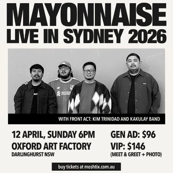 Get ready for a night of pure OPM rock as Mayonnaise, one of the Philippines’ most iconic alternative rock bands, takes the stage in Sydney. Known for hits like Jopay, Bakit Part 2, and Tayo Na Lang Dalawa, the band brings their signature blend of nostalgia, energy, and emotion.