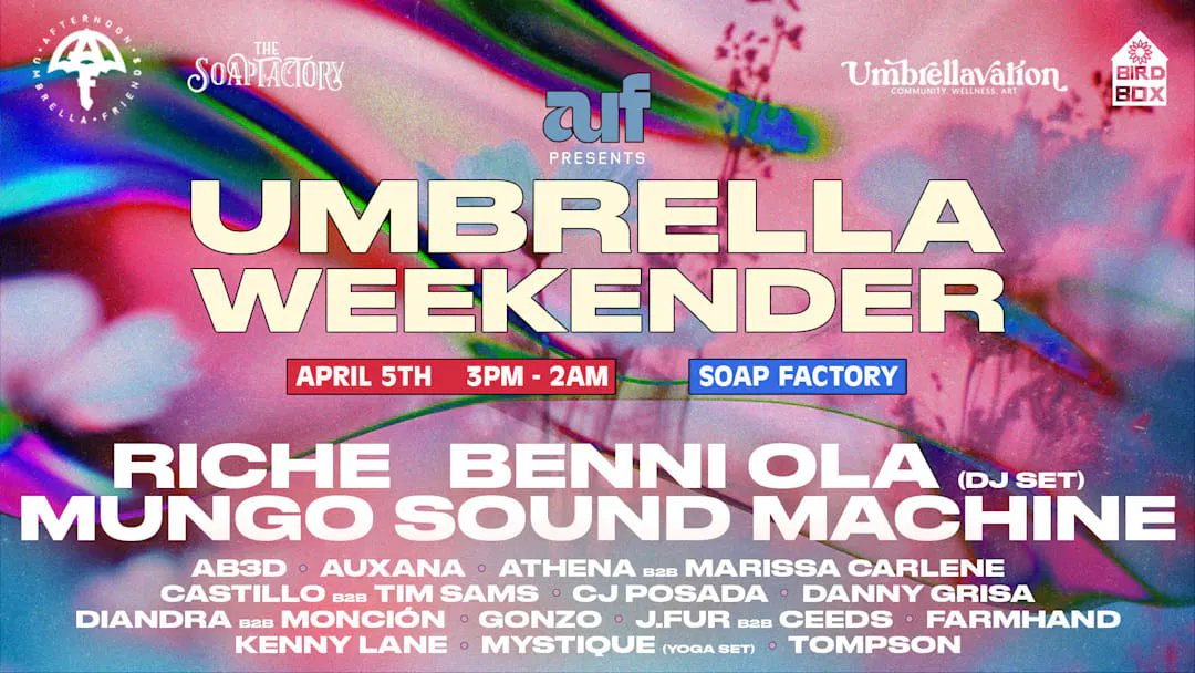 We close out the Weekender at the Soap Factory with Mungo Sound Machine, Riche, and Benni Ola — an all-day-into-night session with Funktion-One sound, the BirdBox, Umbrellavation workshops, and vendors. From afternoon sun to late-night dancing.