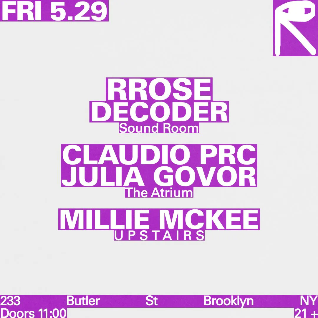 Two of the fresher voices in contemporary techno make their debuts at 233. Rrose’s mesmerizing groove and remorseless, industrial atmospheres hypnotize through gradual ebbs and flows and irresistible, rolling basslines. Decoder’s sci-fi sound resembles the more playful sides of Aleksi Perälä and Perlon-era minimalism. In The Atrium, Claudio PRC and Julia Govor thread ambient-explorative, precision techno into hypnotic, far-reaching journeys, while Millie McKee shares a far-reaching range of cosmic mind + body music UPSTAIRS.