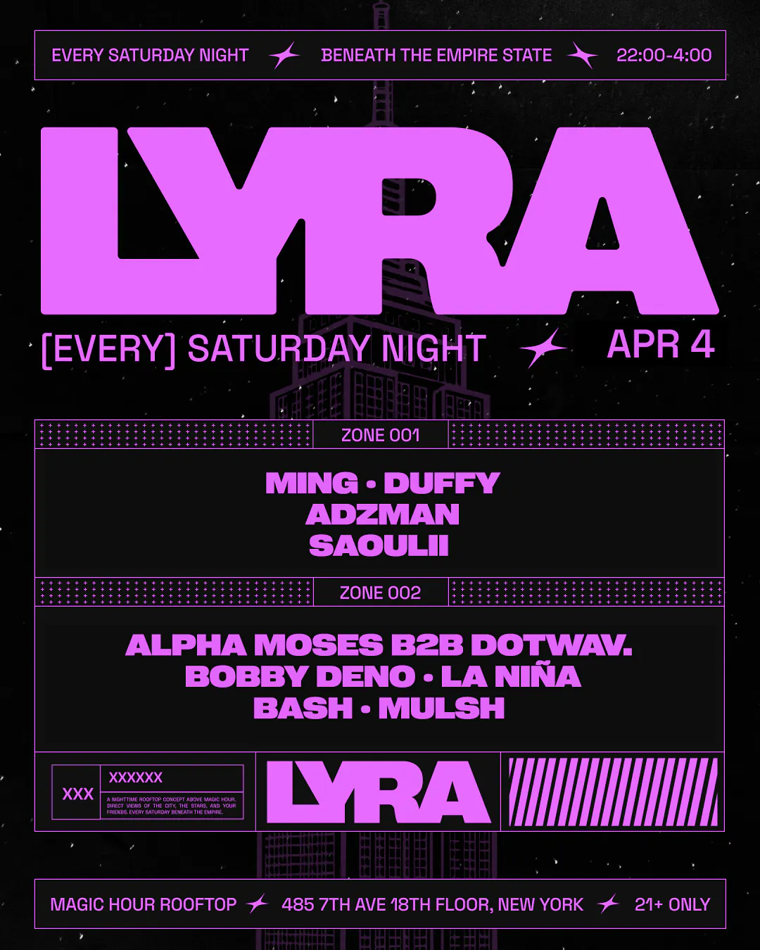 Introducing Lyra - a new rooftop party concept redefining Saturday nights in NYC. Perched beneath the Empire State Building with a retractable roof and panoramic skyline views, Lyra delivers two immersive zones of high-energy sound and atmosphere.