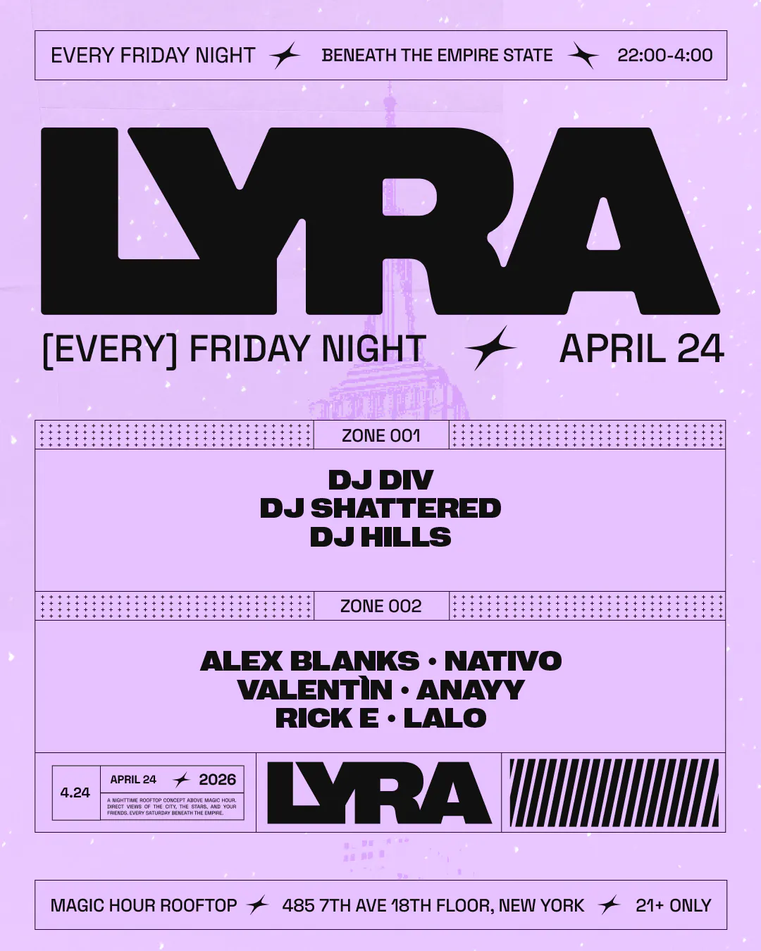 Introducing Lyra - a new rooftop party concept redefining Friday nights in NYC. Perched beneath the Empire State Building with a retractable roof and panoramic skyline views, Lyra delivers two immersive zones of high-energy sound and atmosphere.