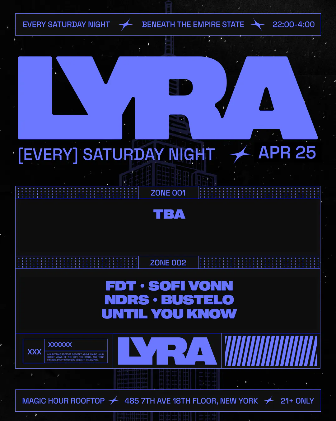 Introducing Lyra - a new rooftop party concept redefining Saturday nights in NYC. Perched beneath the Empire State Building with a retractable roof and panoramic skyline views, Lyra delivers two immersive zones of high-energy sound and atmosphere.