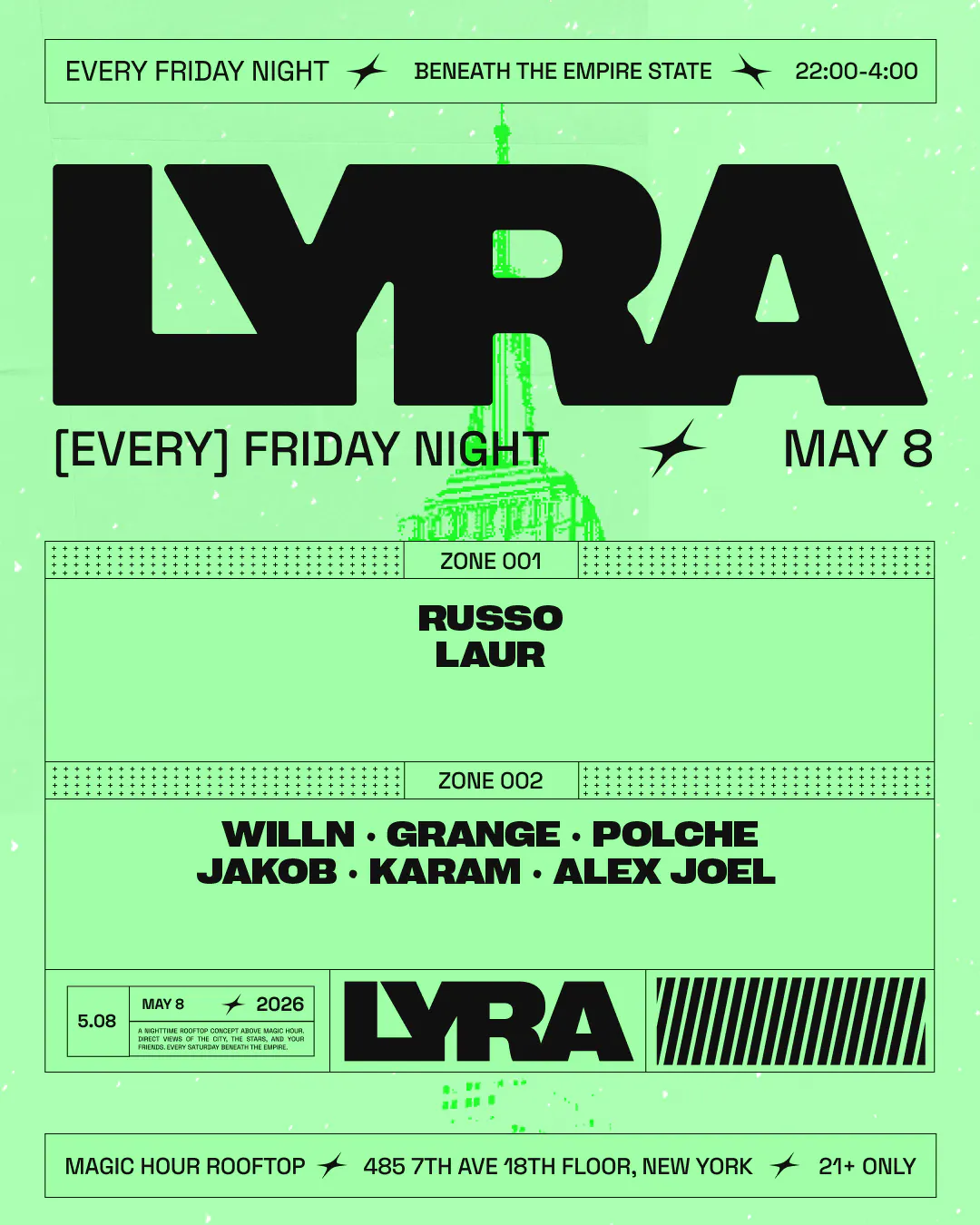 Introducing Lyra - a new rooftop party concept redefining Friday nights in NYC. Perched beneath the Empire State Building with a retractable roof and panoramic skyline views, Lyra delivers two immersive zones of high-energy sound and atmosphere.