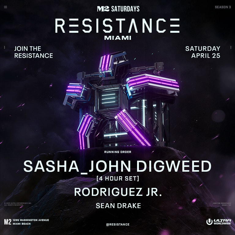 Season 3 of RESISTANCE Miami continues on Saturday, April 25, at M2 Miami with Sasha\_John Digweed, Rodriguez Jr., and Sean Drake. Presented by RESISTANCE Miami. This is a 21+ event