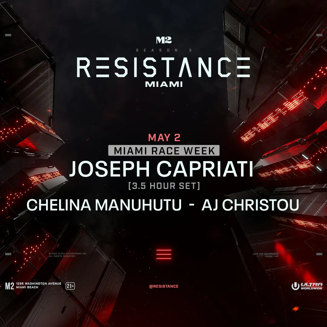 Season 3 of RESISTANCE Miami continues on Saturday, May 2 for Miami Race Week, at M2 Miami with Joseph Capriati, Chelina Manuhutu, and AJ Christou. Presented by RESISTANCE Miami. This is a 21+ event