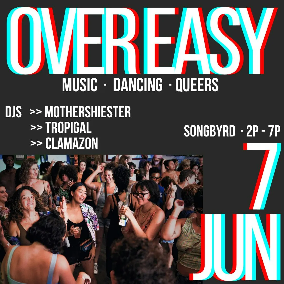 Soundtracked by DJs Mothershiester, Tropigal, and Clamazon, we invite you to join us on the dance floor, or meet us on the open-air patio, for a cute, queer celebration. And stay a little later this year—we’re keeping the party going from 2 to 7 p.m. As always, Over Easy remains a trans-positive, all-gender-inclusive, anti-racist, pro-consensual-makeout space.