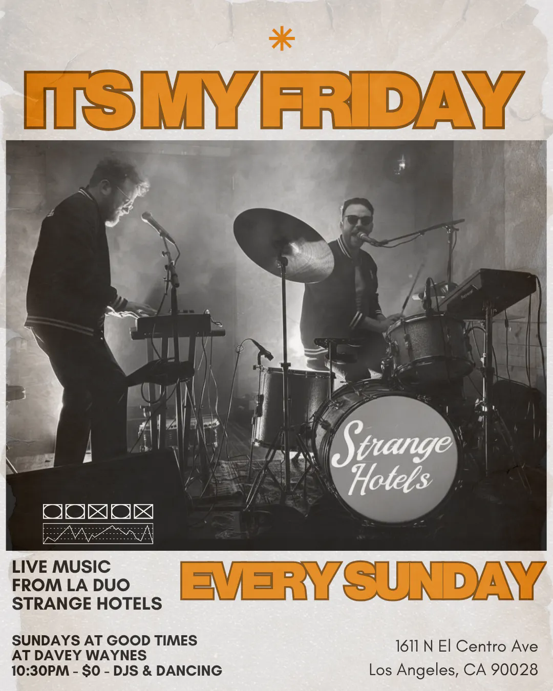 Acclaimed Los Angeles dance/psych duo, Strange Hotels takes the stage every Sunday at historic Hollywood speakeasy Good Times at Davey Wayne’s. Dance all night with non stop 70’s fueled DJ sets to follow.