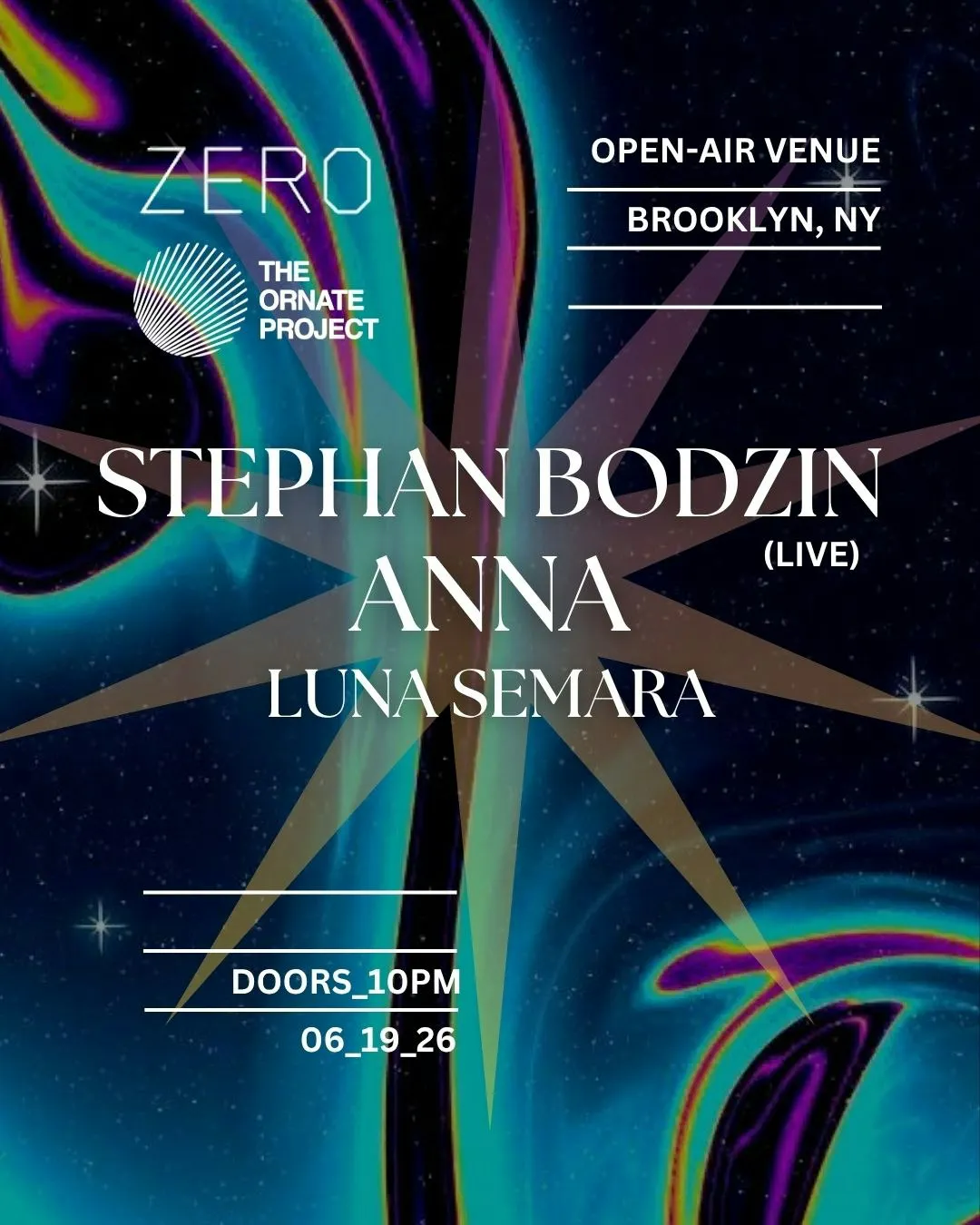 Friday, June 19th, 2026 ZERO & ORNATE PROJECT Present STEPHAN BODZIN (live) ANNA LUNA SEMARA Location: Brooklyn, NY (Location TBA) Doors Open: 10pm 21 + Proper I.D. Required Presented by ZERO & The Ornate Project This is an 21 + event