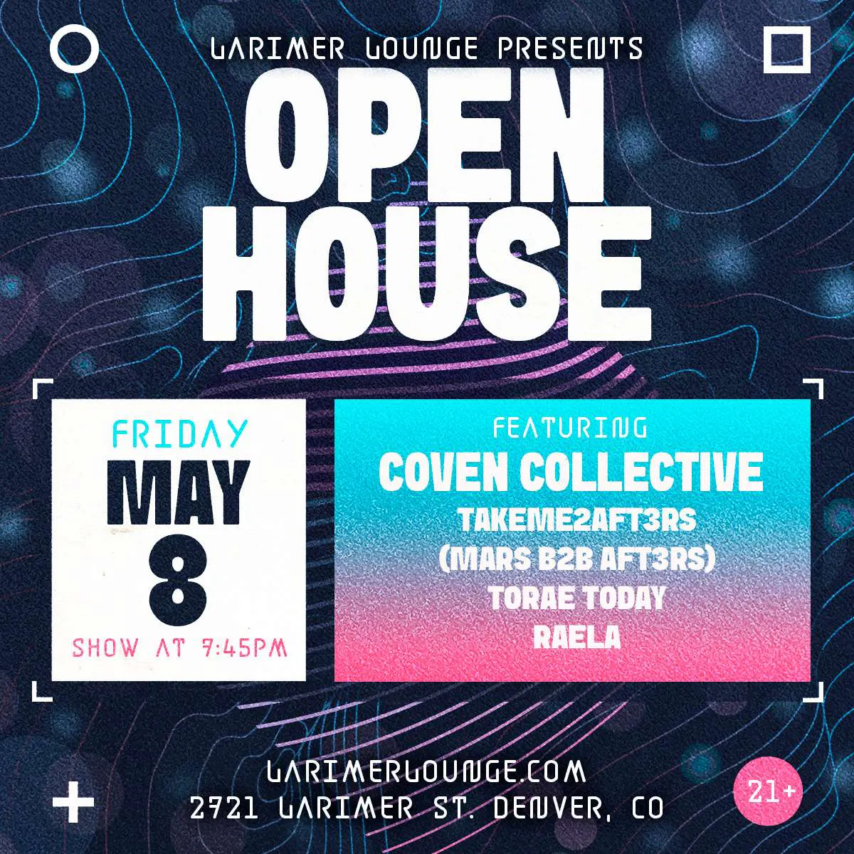 Coven Collective presents Open House featuring TAKEME2AFT3RS (MARS B2B AFT3RS) with Torae Today and RAELA (FREE EVENT) on Friday, May 8th.