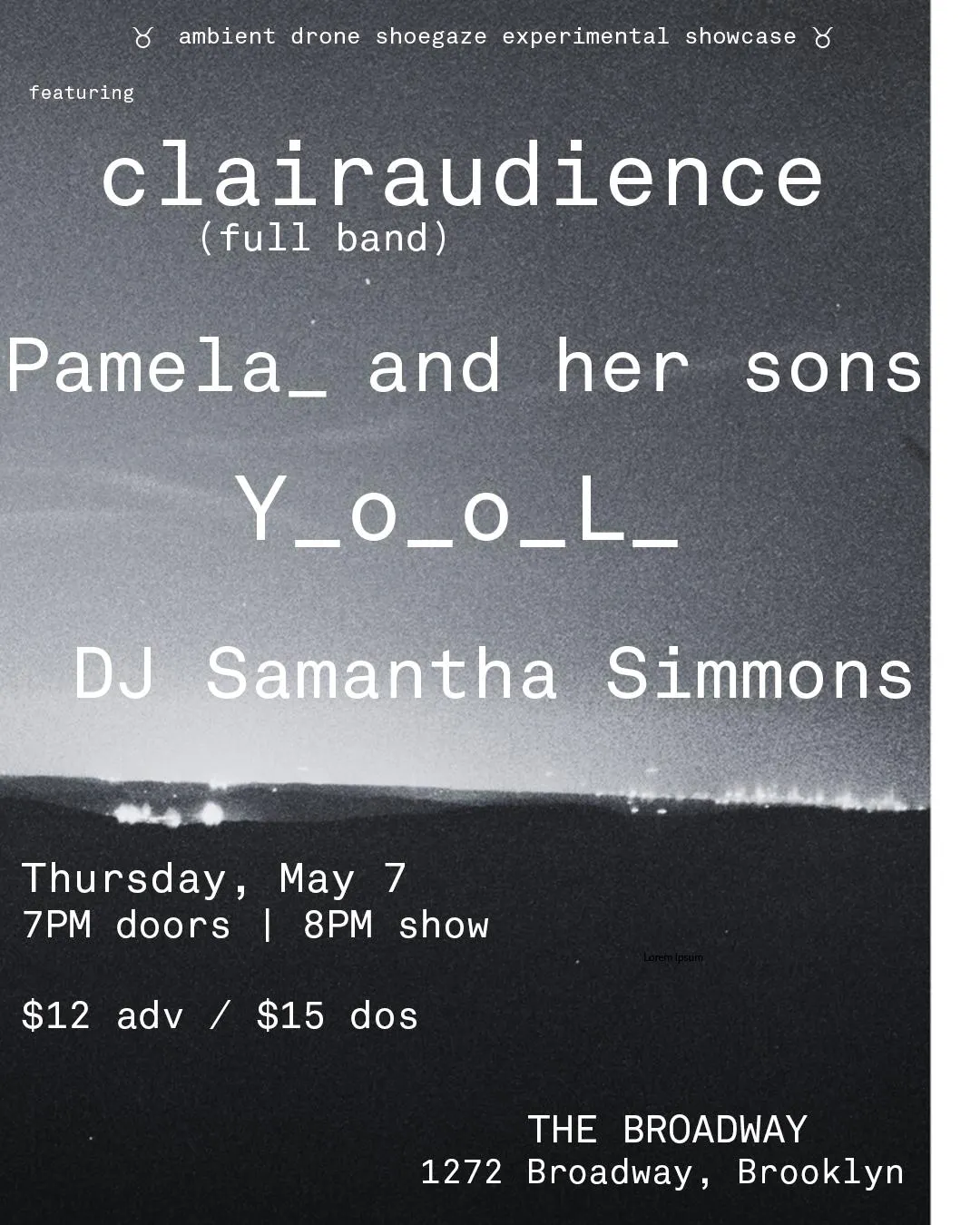 An ambient drone shoegaze experimental showcase at The Broadway ft clairaudience, pamela_ and her sons, y_o_o_l__ + DJ Samantha Simmons