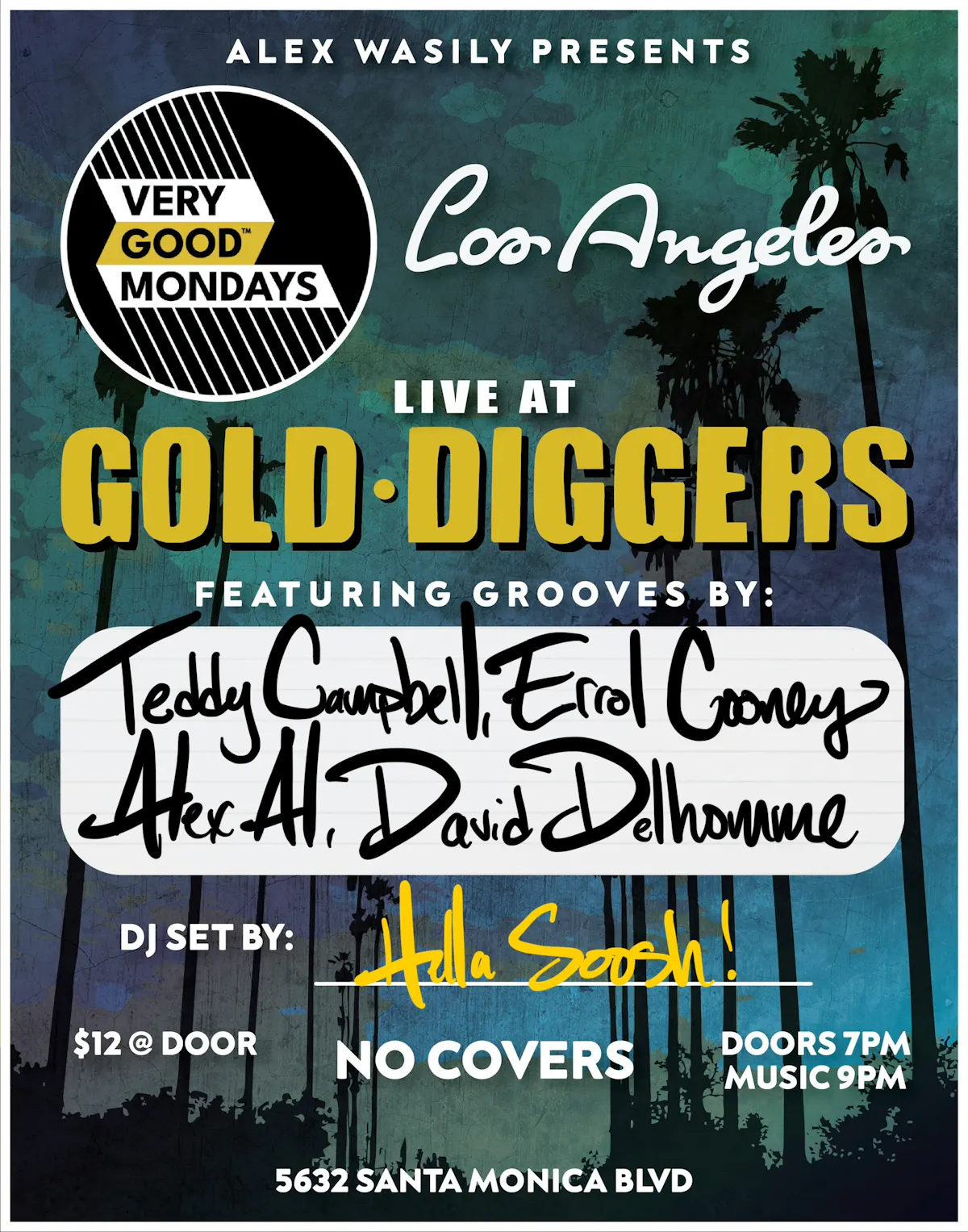 Alex Wasily's very good™ mondays is LA's weekly jam you just can't miss. Enjoy featured performances by Teddy Campbell, Errol Cooney, Alex Al, and David Delhomme! Hella Soosh will be holding it down inbetween jams and after-party grooves.