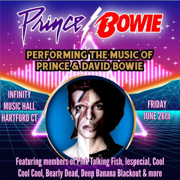 Prince/Bowie is a tribute fusion band that combines the music of Prince and David Bowie into a high energy live show. It features an Allstar cast of characters from various national acts including Pink Talking Fish, lespecial, Cool Cool Cool, Bearly Dead, Deep Banana Blackout and more. This band was created by Eric Gould, the founder of Pink Talking Fish, who has specialized in producing acts that add a unique flavor to the Tribute Genre. The mix of the Prince and David Bowie songbooks blend beautifully and an extra spice is added with master composer, Matt Wayne, creating unique horn arrangements that enhance the music in an exceptional way.
