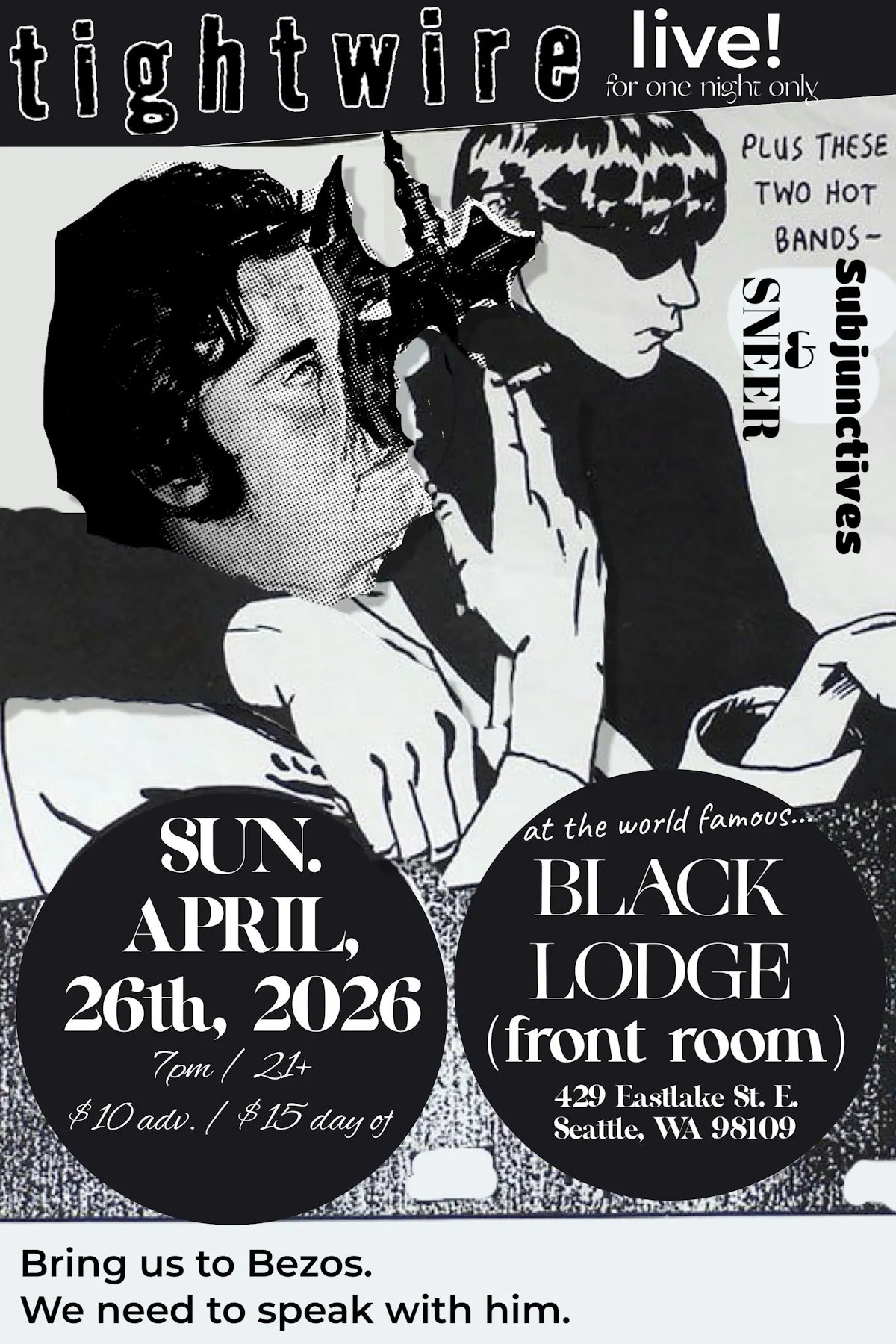 Black Lodge Presents Tightwire The Subjunctives Sneer In the Front Room Presented by The Vera Project. All ages