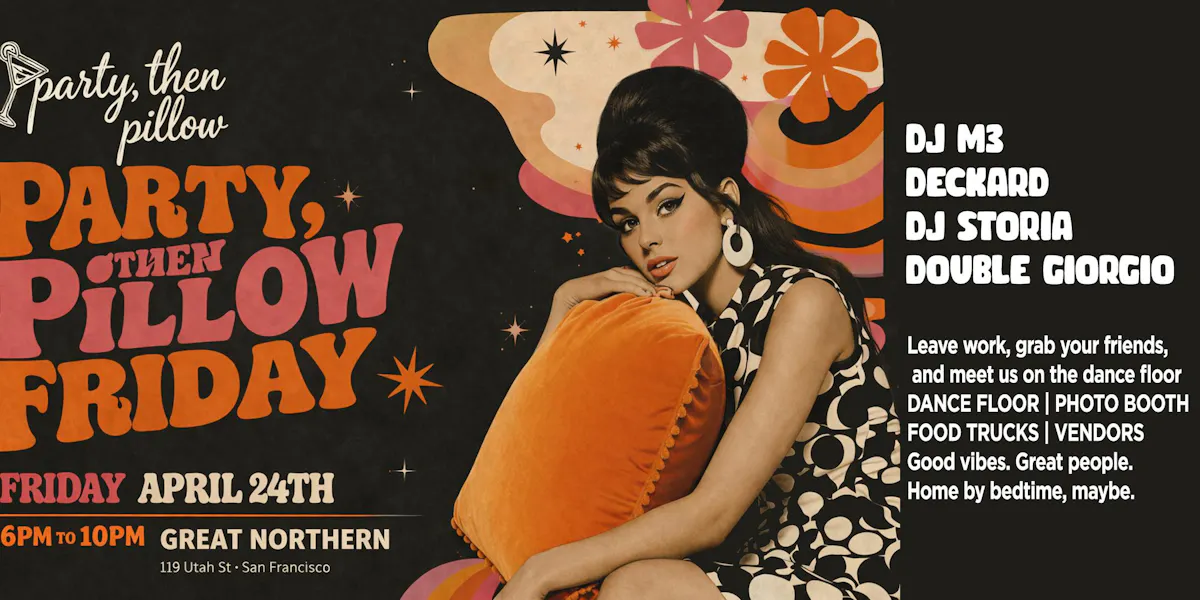 Leave work, grab your crew, and meet us on the dance floor Friday, April 24th at Great Northern. Party, Then Pillow runs 6PM–10PM—just enough time to catch a vibe and still wake up feeling good.