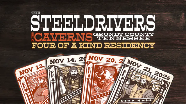 Few bands are as tied to THE CAVERNS as THE STEELDRIVERS. This November, they return to GRUNDY COUNTY, TN for a rare four-night “Four of a Kind” residency, NOVEMBER 13 & 14 and NOVEMBER 20 & 21, 2026. From the very first Bluegrass Underground show in 2008 to today, their performances have become a defining part of the underground experience—each night offering something a little different.