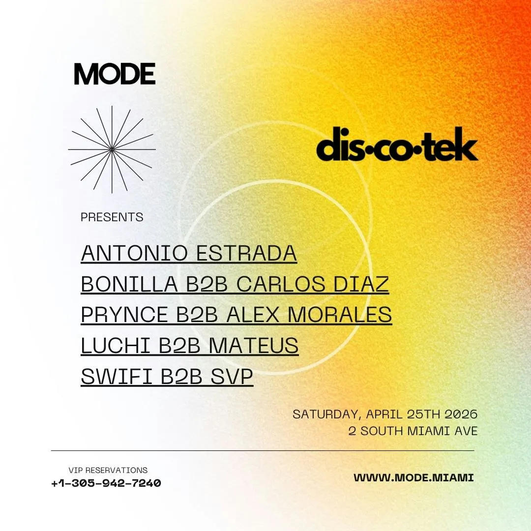 Dis-co-tek returns to MODE for a night built on groove, color, and close connection. Lights low, impeccable sound, dancers shoulder to shoulder. Expect crisp percussion, rolling basslines, and smart handoffs that climb from warm open to late heat.