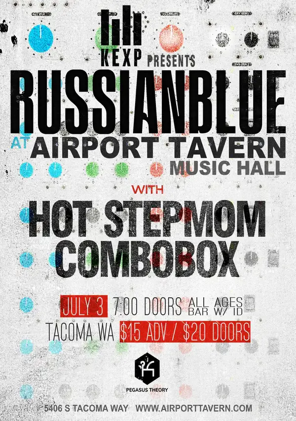 KEXP Presents: RUSSIAN BLUE with support from Hot Stepmom and Combobox hits Airport Tavern Music Hall on Friday, July 3, 2026 for a stacked all-ages night of sharp-edged, forward-thinking Northwest rock. Doors open at 7PM, music starts at 8PM.