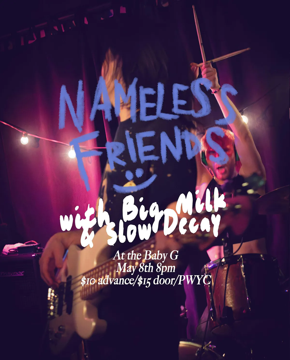 Heavy, glittery nonsense takes over the Baby G ✨ Nameless Friends has a new album, Big Milk has a new set, and Slow Decay has the best outfits. Let’s rage 👹 Presented by The Baby G. This is an 19+ event