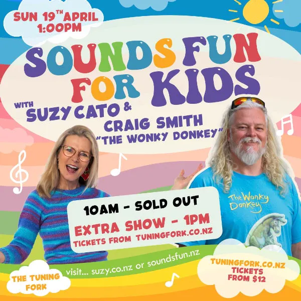 Join Suzy Cato and the Wonky Donkey man - Craig Smith for a very special SOUNDS FUN show, for April! An hour of songs, stories and sillines followed by arts and crafts, your chance to make music, and loads of fun! The Tuning Fork’s barista will have the coffee machine cranking for mum and dad, too!