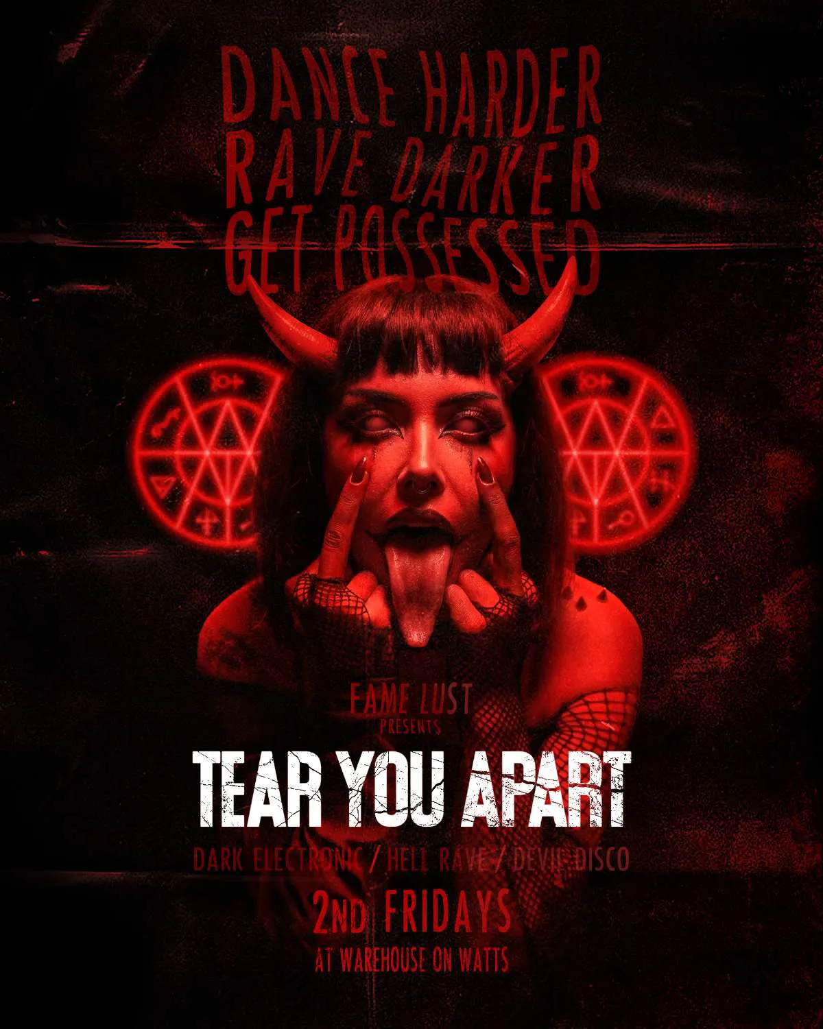 dance harder. rave darker. get possessed. T E A R YOU A P A R T (dark electronic / hell rave / devil disco) at warehouse on watts 9pm - 2am sounds by fame lust featuring the devil rave dancers join the congregation 21+