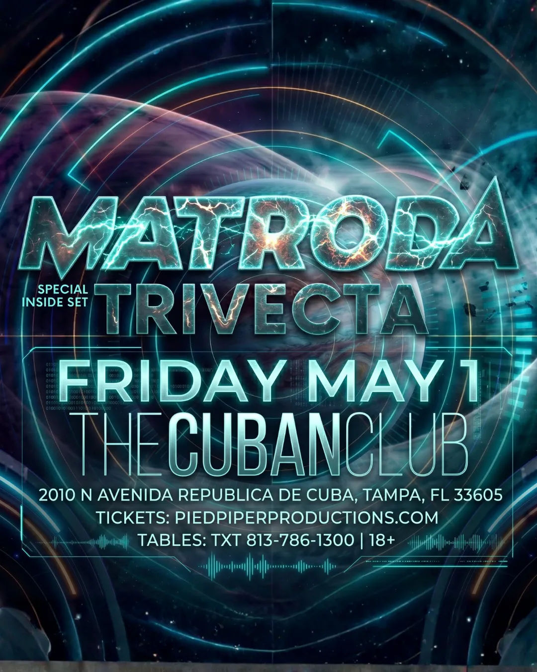 MATRODA returns to Tampa May 1st, at the Cuban Club! Immediately after, TRIVECTA will play inside. MATRODA (MAIN STAGE) TRIVECTA (IN STUDIO-C) Click for: TABLES