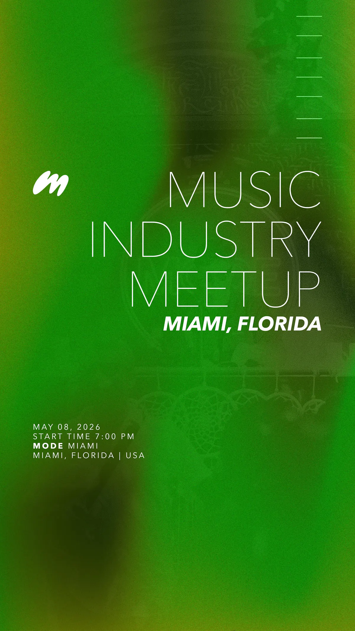 This in-person event is designed to bring together Miami’s music creators, professionals, and enthusiasts in a welcoming and engaging setting. Whether you're a producer, artist, DJ, manager, or simply passionate about the music industry, this is a chance to connect, exchange ideas, and build meaningful relationships within the local scene.