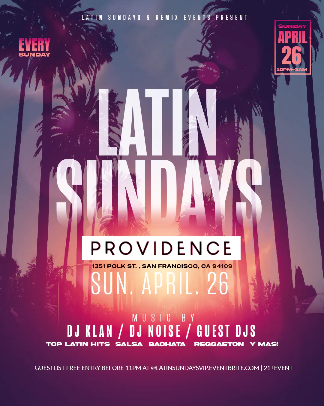 LATIN SUNDAYS at PROVIDENCE - Every Sunday Latin Music Party Every Sunday at Providence! Fiesta Latina Todos Los Domingos 💃🔥 Top Latin Hits, Salsa, Bachata, Reggaeton, Hip-Hop y Mas!🥂🎶 🔉Music: @IMDJNOISE + @DJKLAN + Guest DJ's 🤟Hosts: @remixeventssf + @djantonioguardado + @latinsundayssf 🎟Free RSVP Guestlist before 10:30pm ✅10pm-2am - 21+ Event Dress Code Enforced: No baggy clothing, tank tops, hoodies, beanies, flip-flops, or backpacks allowed! —— #musicalatina #reggaeton #latinmusic #hiphop #openformat #SanFrancisco #SF #thecity #sfgate #Bayareabuzz #sfparty #sfevents #sfweekly #partysf #weeklysf #sanfranciscoparty #bayarea #sfclubs #sfclubbing #dothebay #rap #music #rapper #trap #beats #hiphopmusic #providenceSF