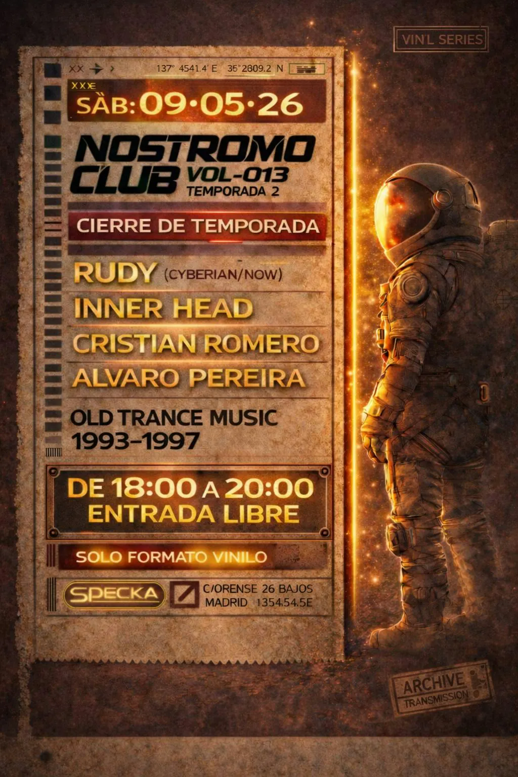 Final de la segunda temporada. Para este día vamos a ser puristas con la idea original de Nostromo para ofrecer una tarde llena de sonidos Trance del pasado. Organizado por Specka Club. Para mayores de 18 años (necesario traer DNI).