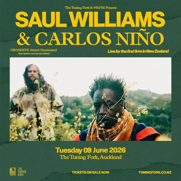 Visionary poet, musician and cultural icon Saul Williams joins forces with acclaimed percussionist, producer and sonic curator Carlos Niño for their first-ever Aotearoa performances this June.