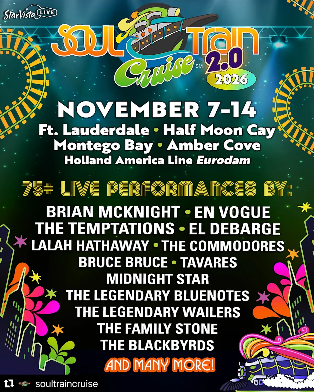 We’re bringin’ the Love, Peace, and Soul BACK to the high seas for the second time in one year on the Soul Train Cruise 2.0, sailing November of 2026! Enjoy over 50 LIVE performances and artist-interactive events including Q&As, dance lessons, panel discussions, nightly theme parties, and so much more! We’re celebrating the iconic television show that started it all – and there’s truly no party like a Soul Train Party!