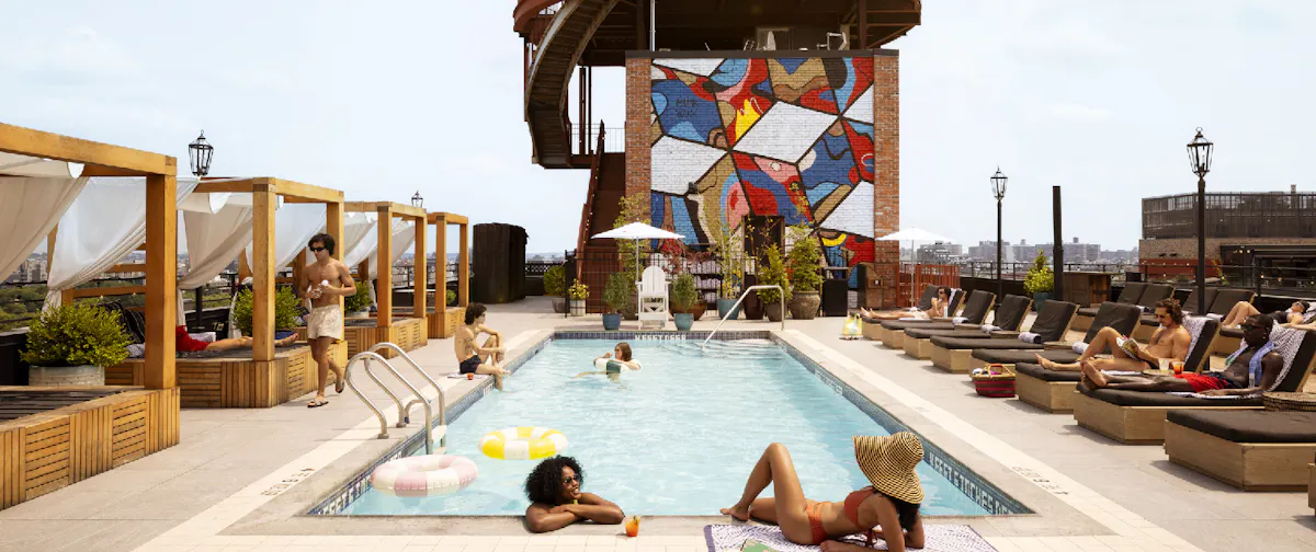 At the heart of the rooftop experience is ART Williamsburg, a dynamic pool deck and bar where guests can unwind by a 40-foot pool, sip craft cocktails, and soak in the rhythm of curated DJ sets and social buzz. Whether it’s a sun-drenched afternoon lounging in a cabana or a lively evening with music and skyline views, the atmosphere effortlessly shifts from relaxed to high-energy.